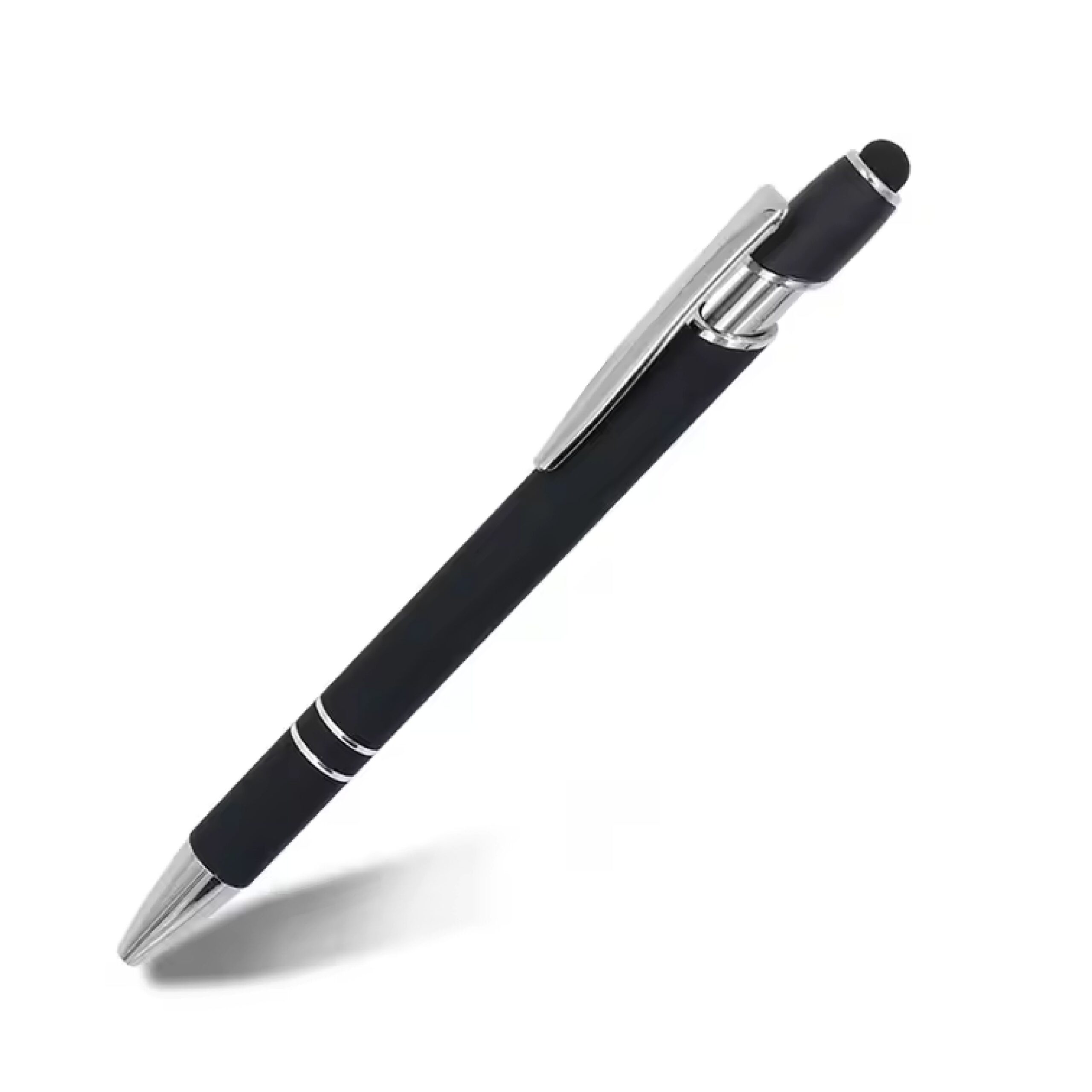 Tyylikäs kuulakärkikynä kosketusnäyttöpäällä. Kestävä alumiinirunko kumipinnoitteella, metalliklipsi, musta muste.