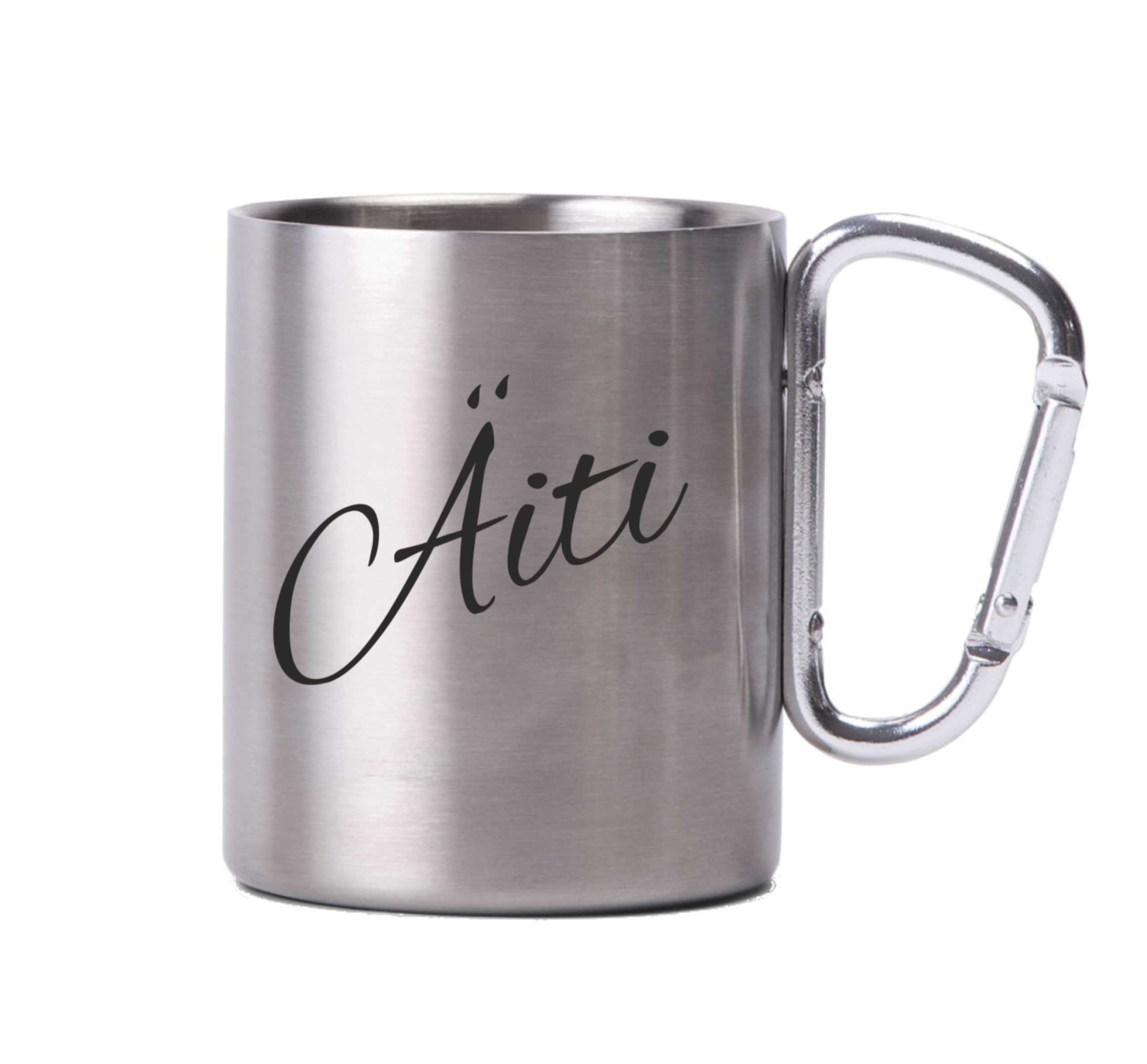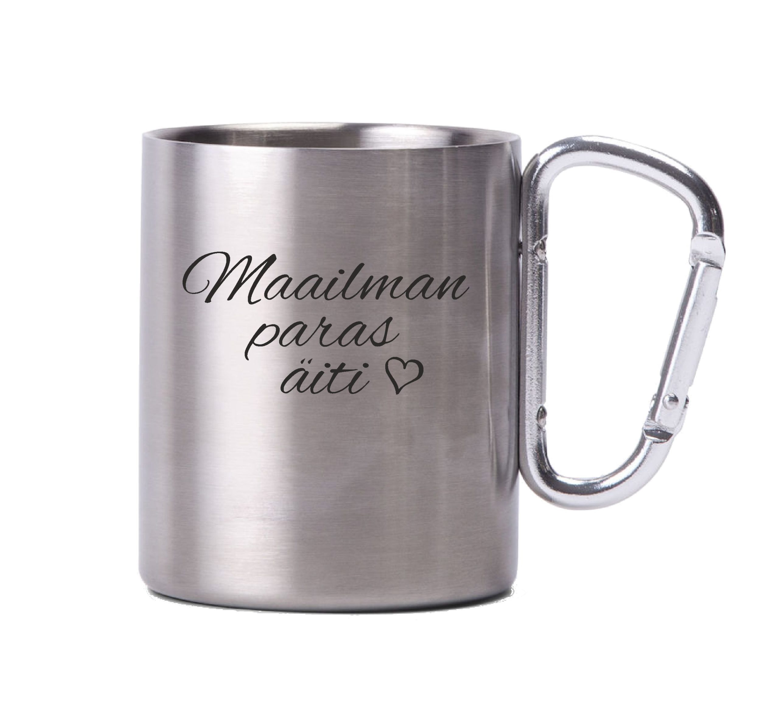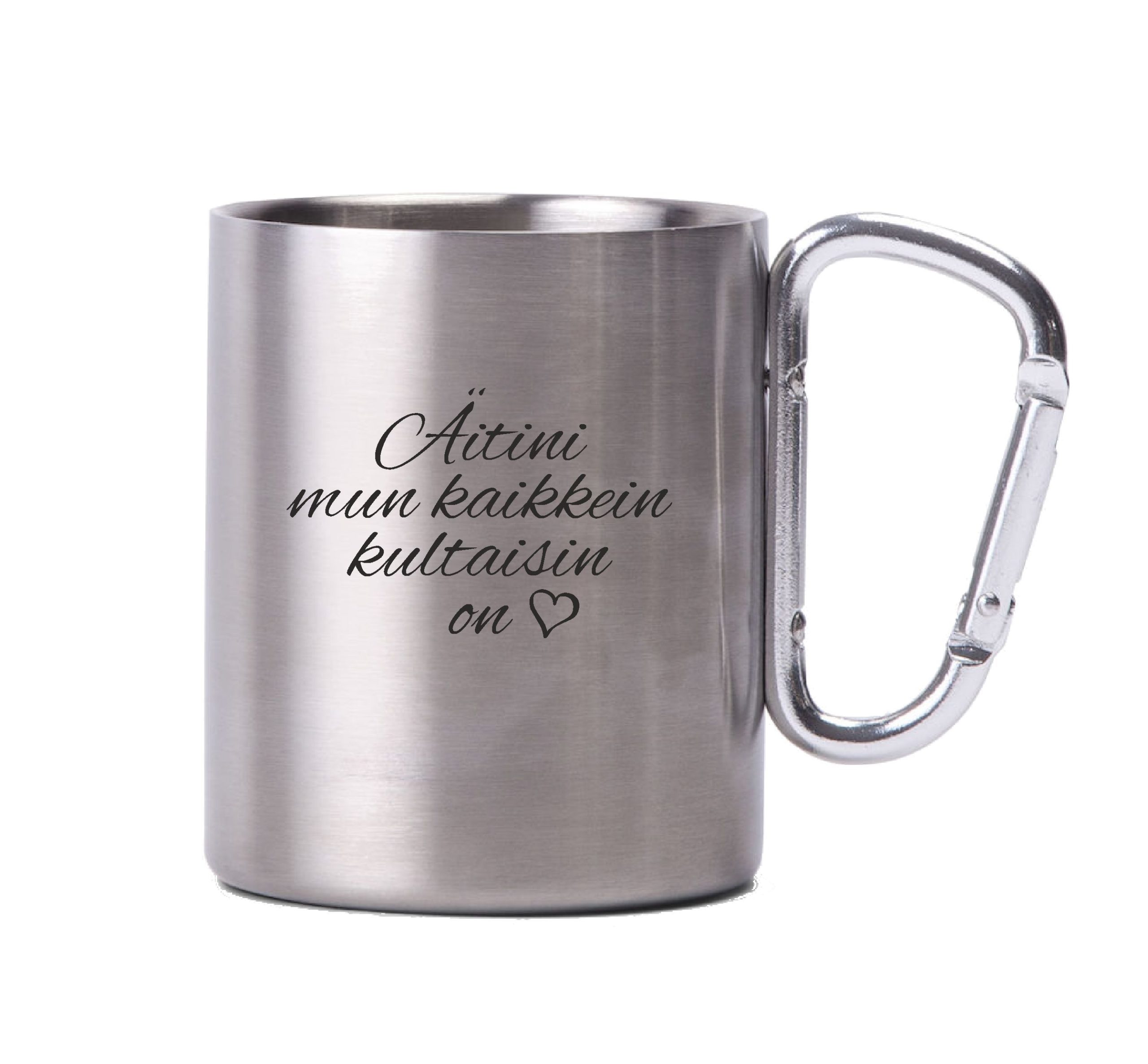 Mukin kahvana on karabiinihakanen, josta mukin voi kätevästi kiinnittää riippumaan reppuun. Muki sopii erinomaisesti retkeilyyn, metsälle ja veneilyyn. Suosittelemme